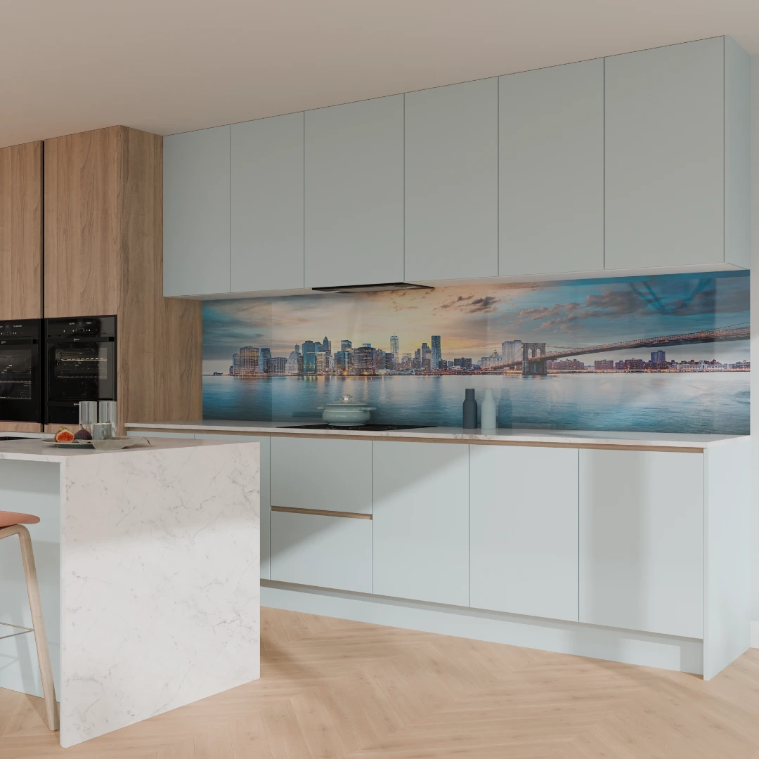 Die Küchenrückwand mit Motiv besteht aus 6 mm Einscheibensicherheitsglas (ESG) nach DIN EN 12150-1. Durch eine spezielle Wärmebehandlung erhält das Glas außergewöhnliche Robustheit – für langanhaltende Sicherheit und Qualität.