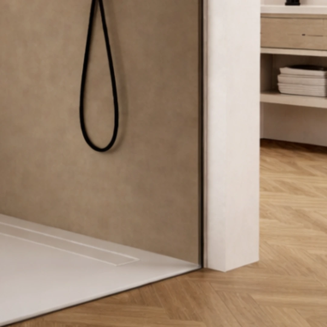Die Duschwand nach Maß aus Bronzeglas verleiht deinem Bad eine warme, elegante Ausstrahlung mit zeitlosem Charakter. Unsere besonders schmalen, hochwertigen Wandprofile sorgen für eine filigrane Optik und gleichen leichte Wandunebenheiten zuverlässig aus.